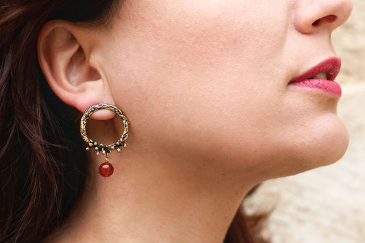 Orecchini tondi Abbracci bruniti con corniola o perla