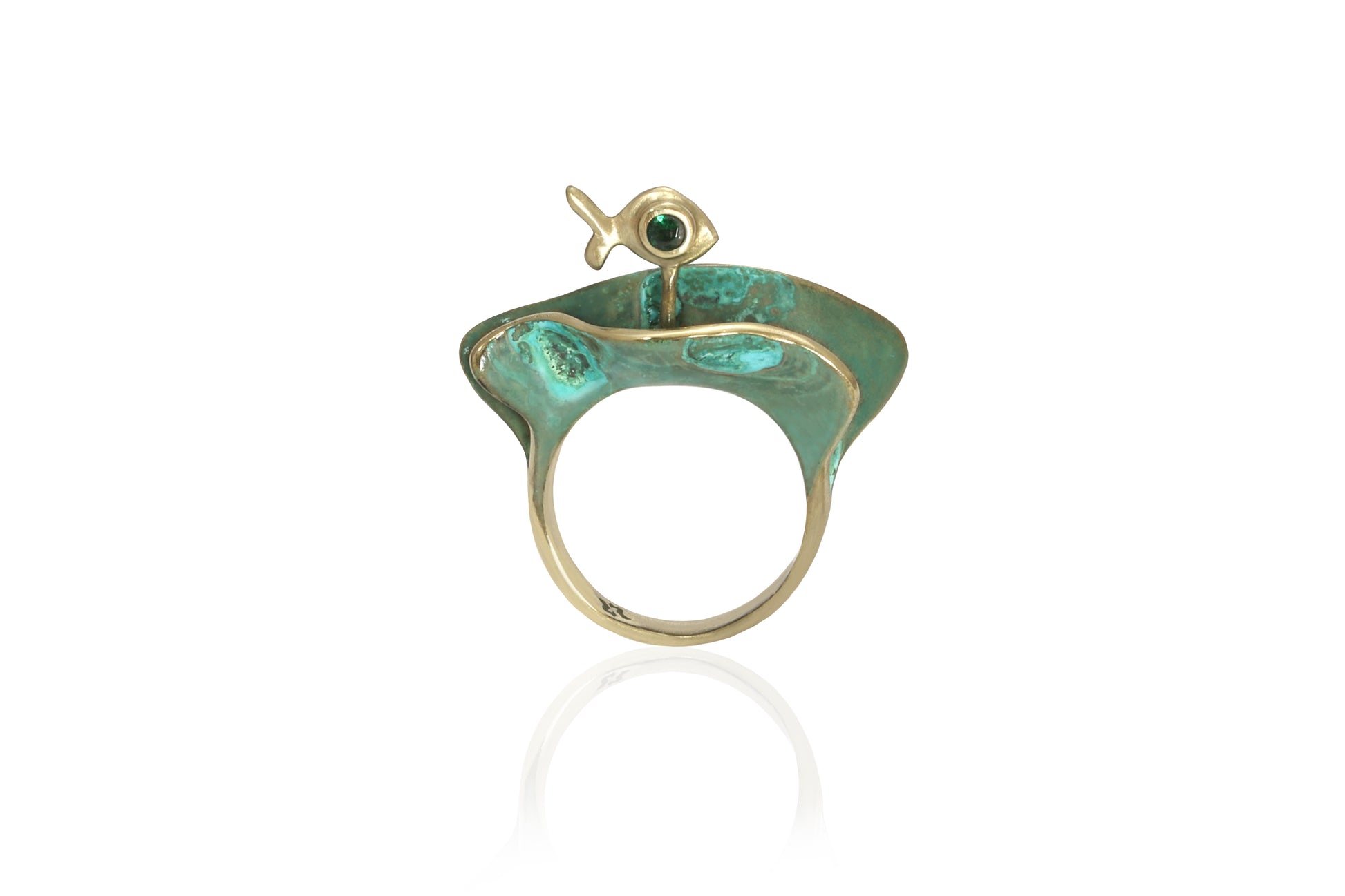 Anello due Onde ottone patina verde e pesciolino
