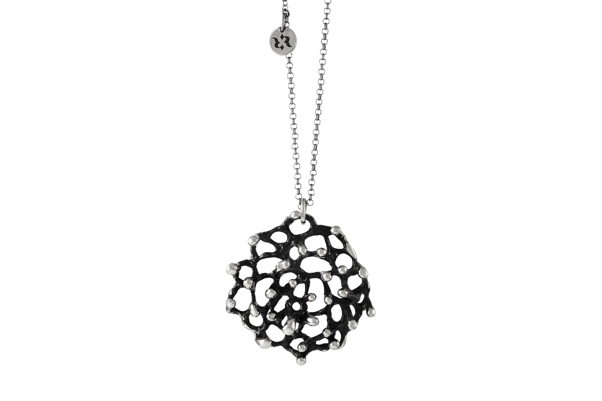 Ciondolo grande, esclusivo, realizzato in ottone brunito, o bronzo rosa brunito, o argento 925 brunito, completo di collana in ottone bagno rutenio, e targhetta con logo.